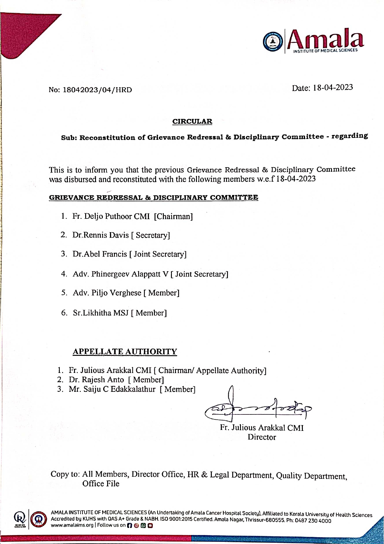 Fr. Julious Arakkal CMI – Chairman / Appellate Authority