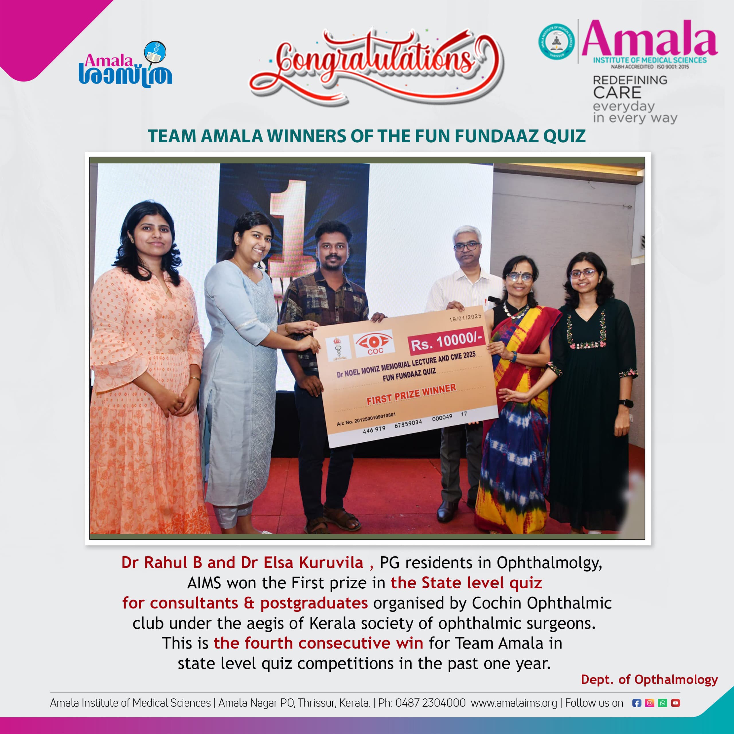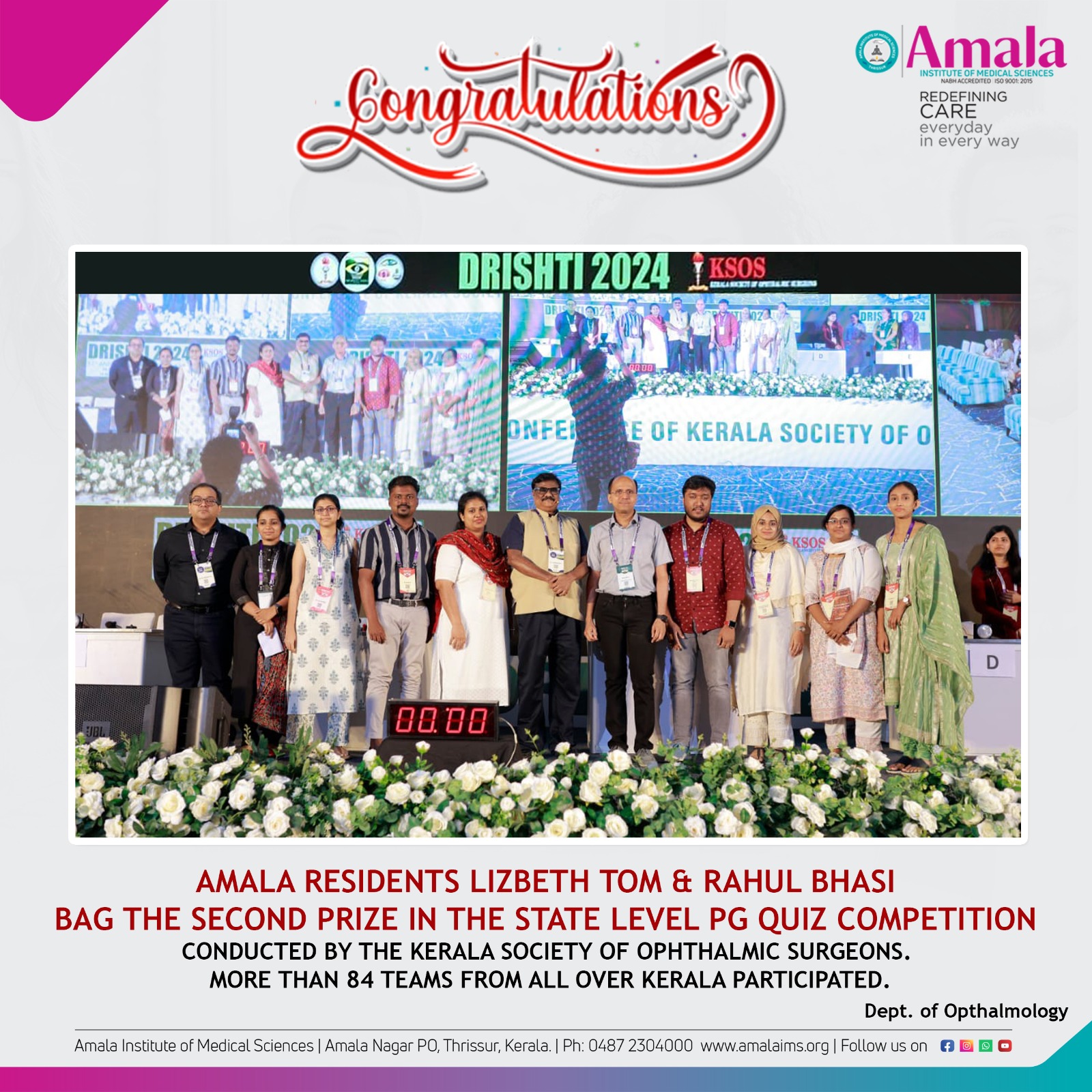 Amala Residents Dr.Lizbeth Tom and Dr. Rahul Bhasi bag the second prize in the State Level PG Quiz competition conducted by the Kerala Society of Ophthalmic Surgeons.