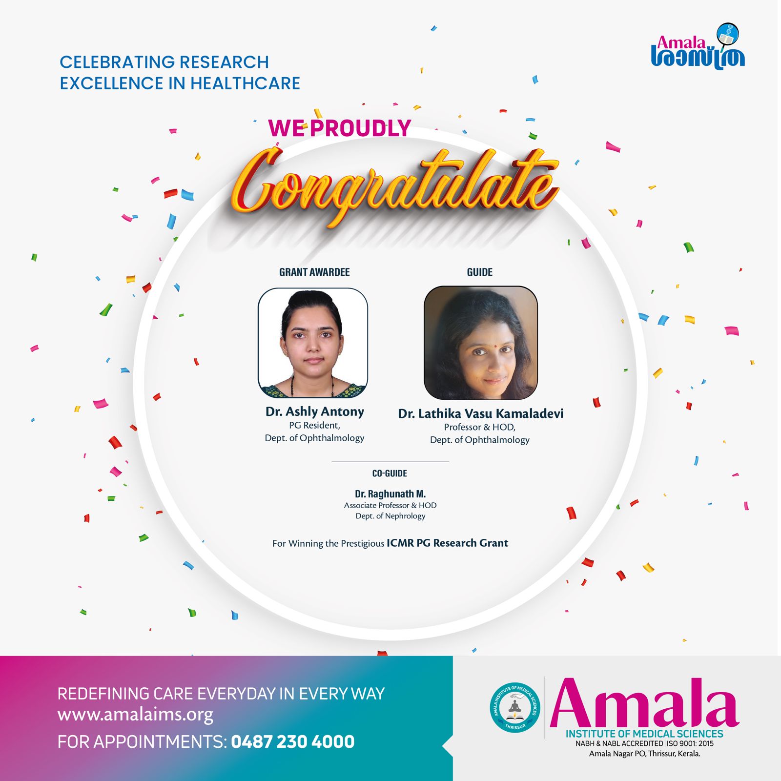 ICMR Research grant to Dr Ashly Antony, PG Resident under the guidance of Dr. Lathika V.K., Professor and Head