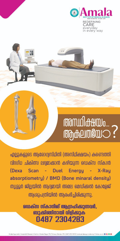 The modern BMD (Bone Mineral Density Machine) installed at Amala Institute of Medical Sciences ,Thrissur in January 2024. AIMS is the only institute in Thrissur district where BMD facility is available. The whole body BMD is used for diagnosis of Osteoporosis. Dexa Scan, measures how much calcium and other types of minerals are in the area of your bone. This test helps the doctor to detect osteoporosis or bone loss and predict your risk for bone fractures.